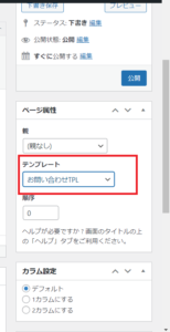 「ページ属性」のテンプレートから「お問い合わせTPL」を選択します。「親」については、親ページがなければ、そのまま親なしでいいと思います。「カラム設定」についても、当サイトはデフォルトのままですが、ご自分のサイトのデザインに合わせて選択することになると思います。